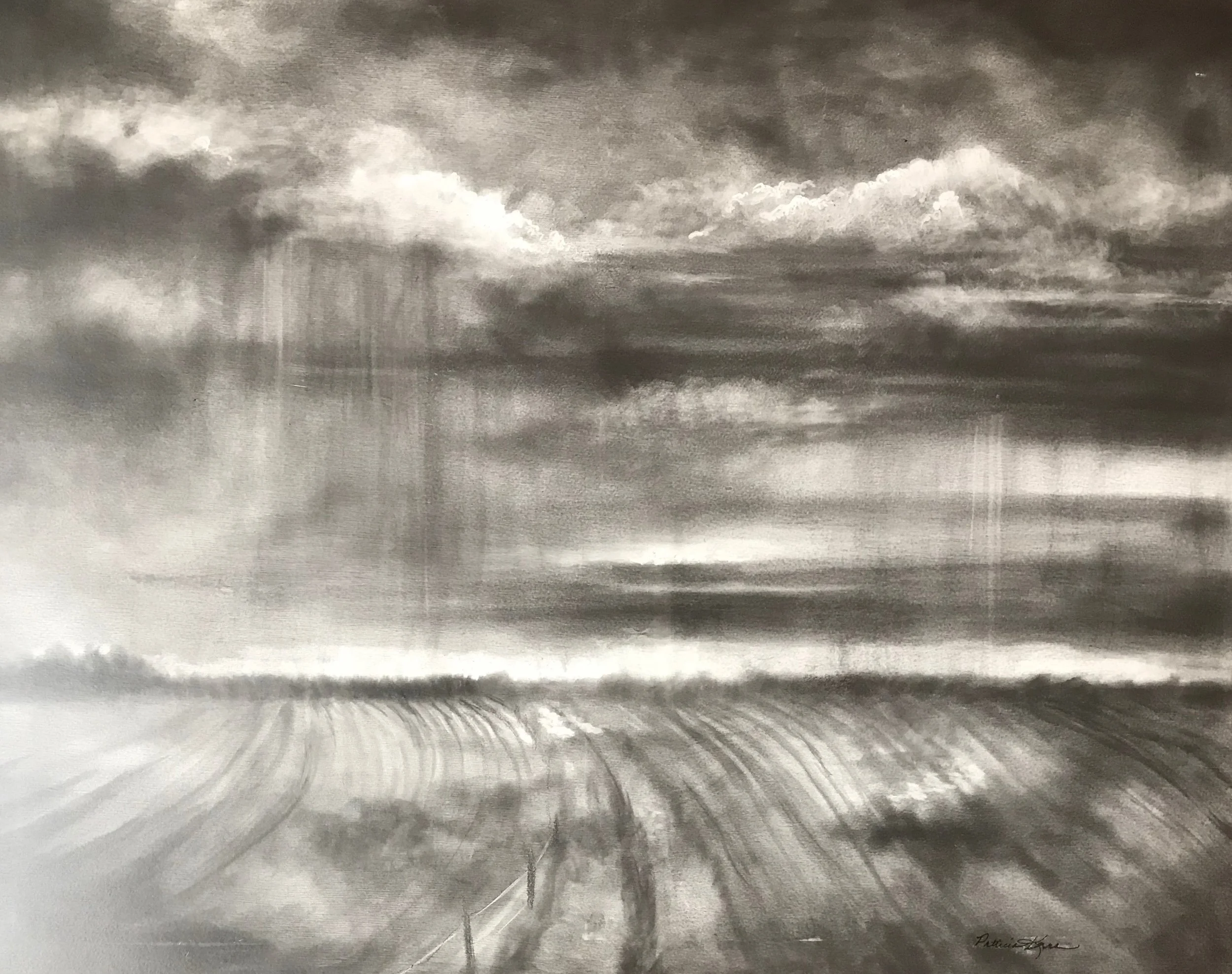 Perhaps her fascination with clouds goes back to childhood days of visiting Aunt Leta who believed one of the best ways to spend the day was lying on the grass watching clouds shape-shift. Obviously cloud-love passes through generations as Pat’s son was an avid storm chaser. Flowers offer the same fleeting perspective of beauty. After retiring a few years ago, Pat—once a multi-media art teacher—has chosen to focus on graphite, pastel, and oil. “I love working from actual life. You are trying to capture that moment. Even with clouds, I am trying to remember that moment.”